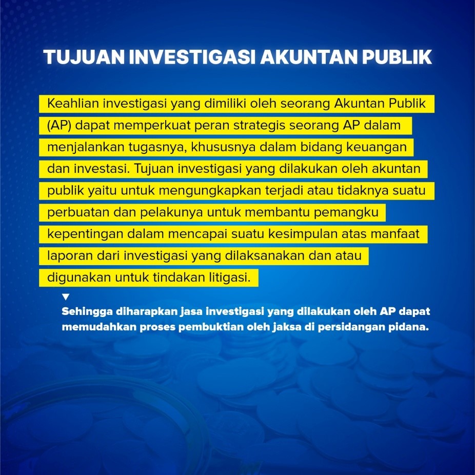 Pendidikan dan Sertifikasi Jasa Investigasi adalah salah satu program sertifikasi finansial Investigator atau sering disebut Certified Financial Investigator (CFI). Program sertifikasi ini dikhususkan bagi Akuntan Publik, CPA Non-AP dan Audit Manajer yang sudah berpraktik minimal selama 3 tahun. Tujuan diselenggarakannya sertifikasi ini untuk menambah kompetensi dan memiliki komitmen etika profesi yang tinggi dalam melaksanakan perikatan investigasi yang berkualitas dan memberikan nilai tambah (value added) bagi pihak-pihak yang berkepentingan (stakeholder) dalam pengambilan keputusan dan penetapan kebijakan yang berkaitan dengan penanganan masalah, kasus perkara atas penyimpangan keuangan.