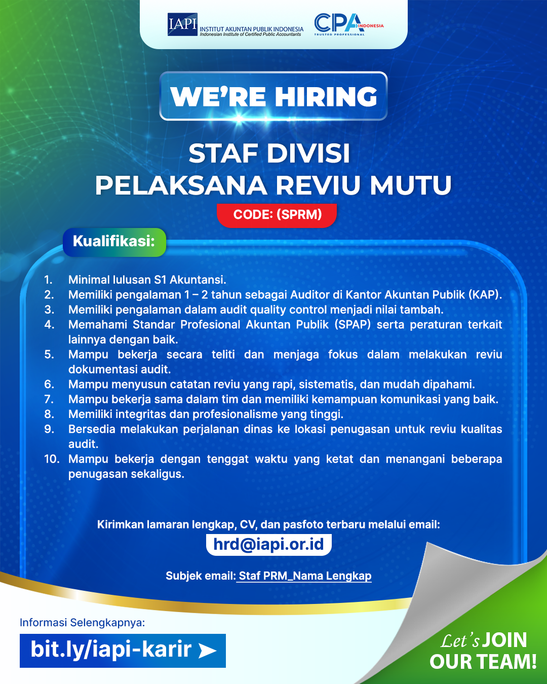 Kirimkan lamaran lengkap, CV, dan pasfoto terbaru melalui email: hrd@iapi.or.id